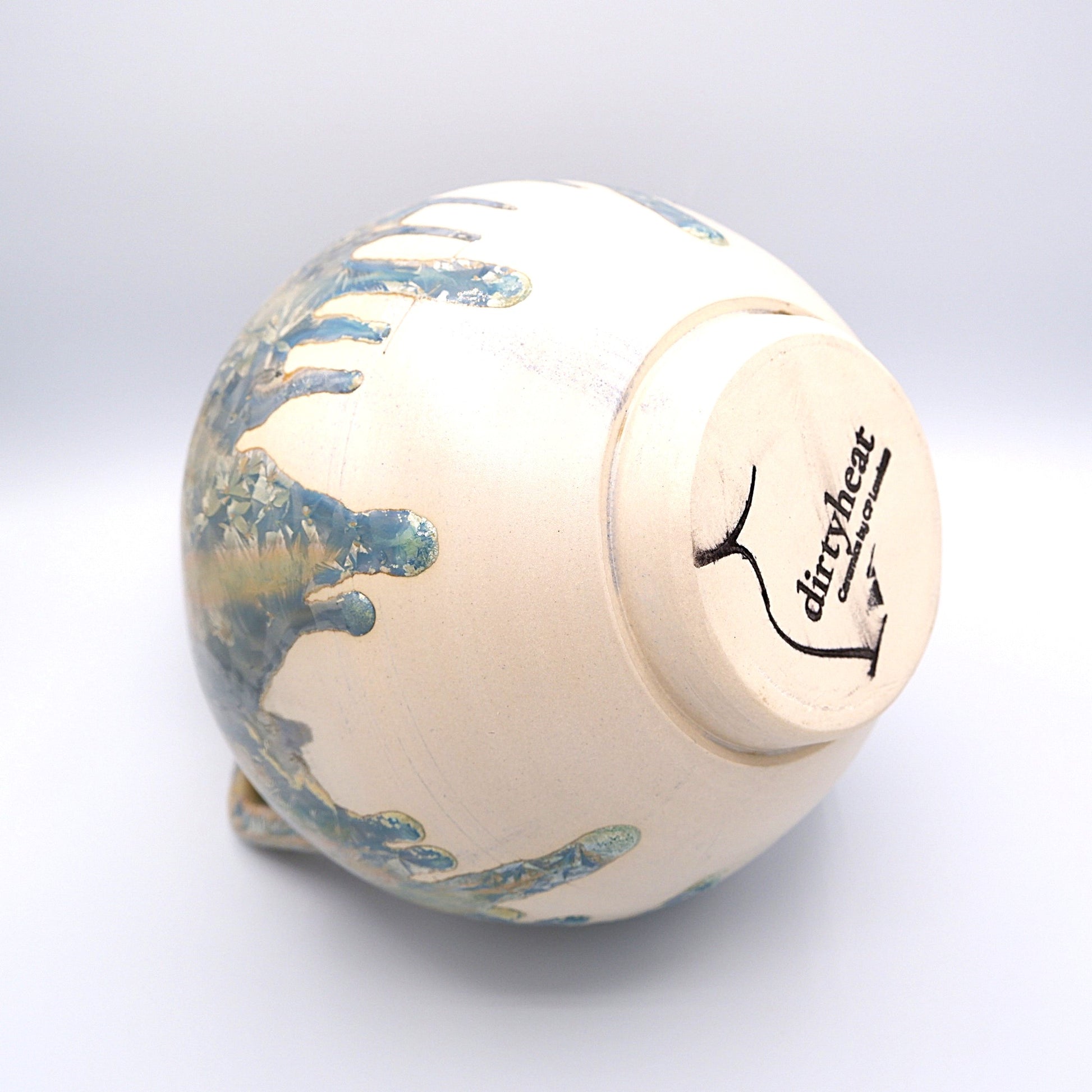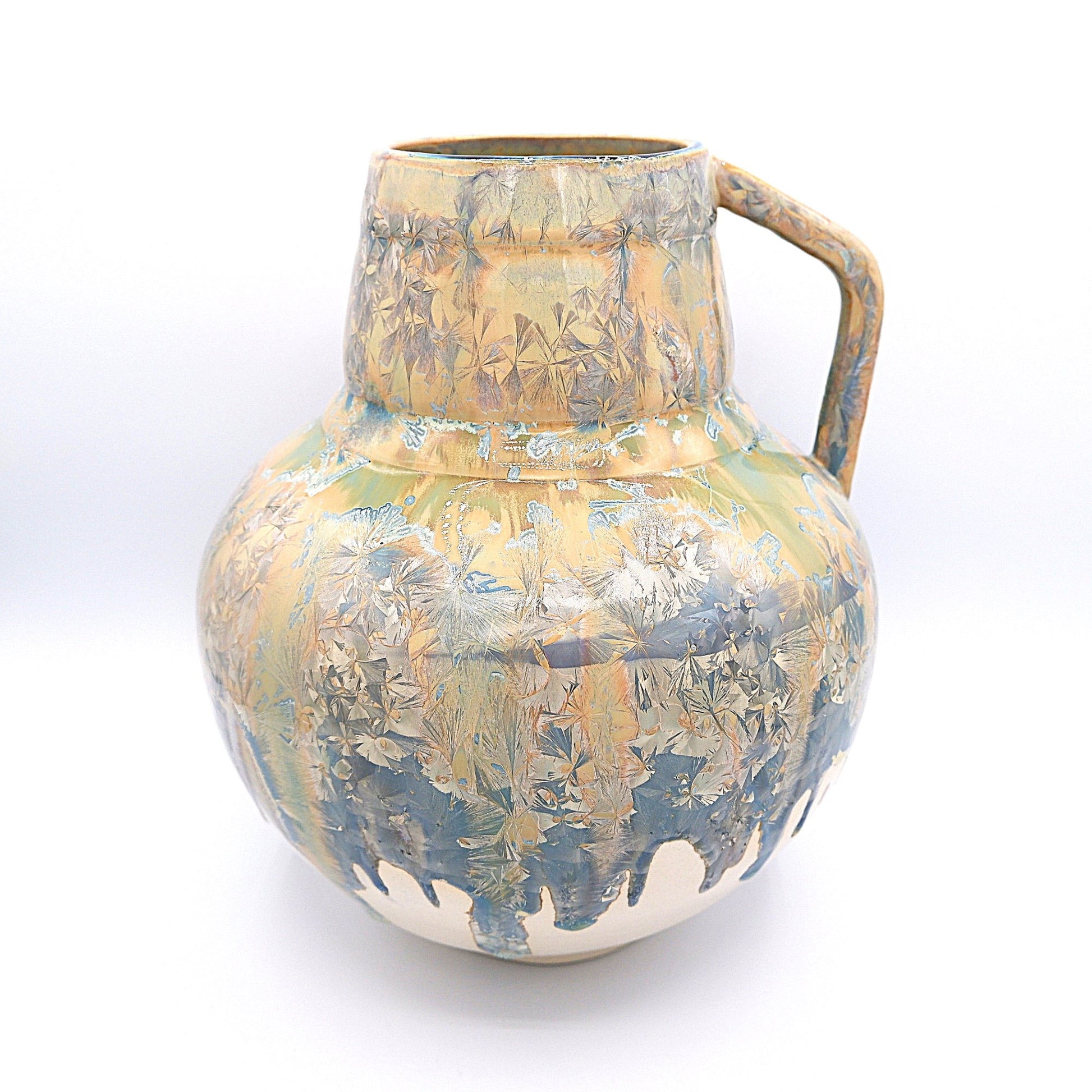 Indulge in the ultimate luxury with our Handled Vase. Masterfully crafted from porcelain, it boasts a unique handle accent and tapered neck for both functionality and beauty. Adorned with a stunning blue crystalline glaze, this vase is both functional and decorative, making it a true work of art for your home.